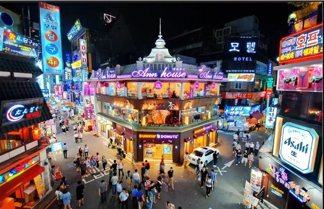 弘大因韩国知名艺术学府弘益大学而得名,是独立艺术与青年文化的发源地。从弘益大学站延伸至合井站的这片区域,白天人流如织,夜晚霓虹闪烁,形成以学生和年轻群体为主要受众的综合性街区 ©网络
