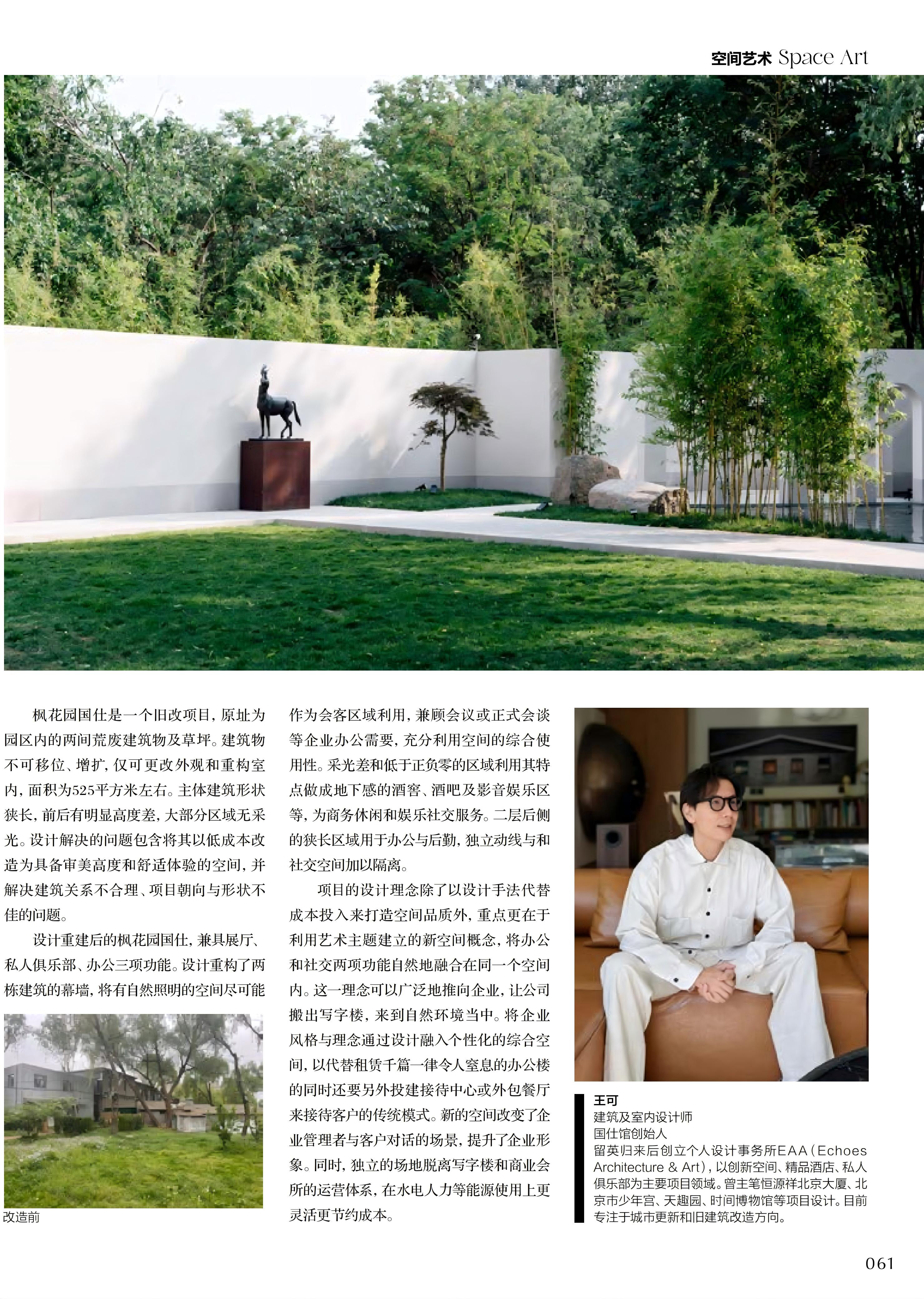 王可:近几年当代艺术回潮,人们对空间的要求也越来越高,对追求精神满足的需求也更强烈。艺术是一种极具包容性的事物,能够极大地提升空间的质感。选对了艺术品,很难说是空间托起了艺术品,还是艺术品赋予了空间能量。它们是相辅相成的,结合后会互相提升。因此我对艺术会有更多思考,会考虑哪种类型的艺术品更适合,如果没有适合的就去造。