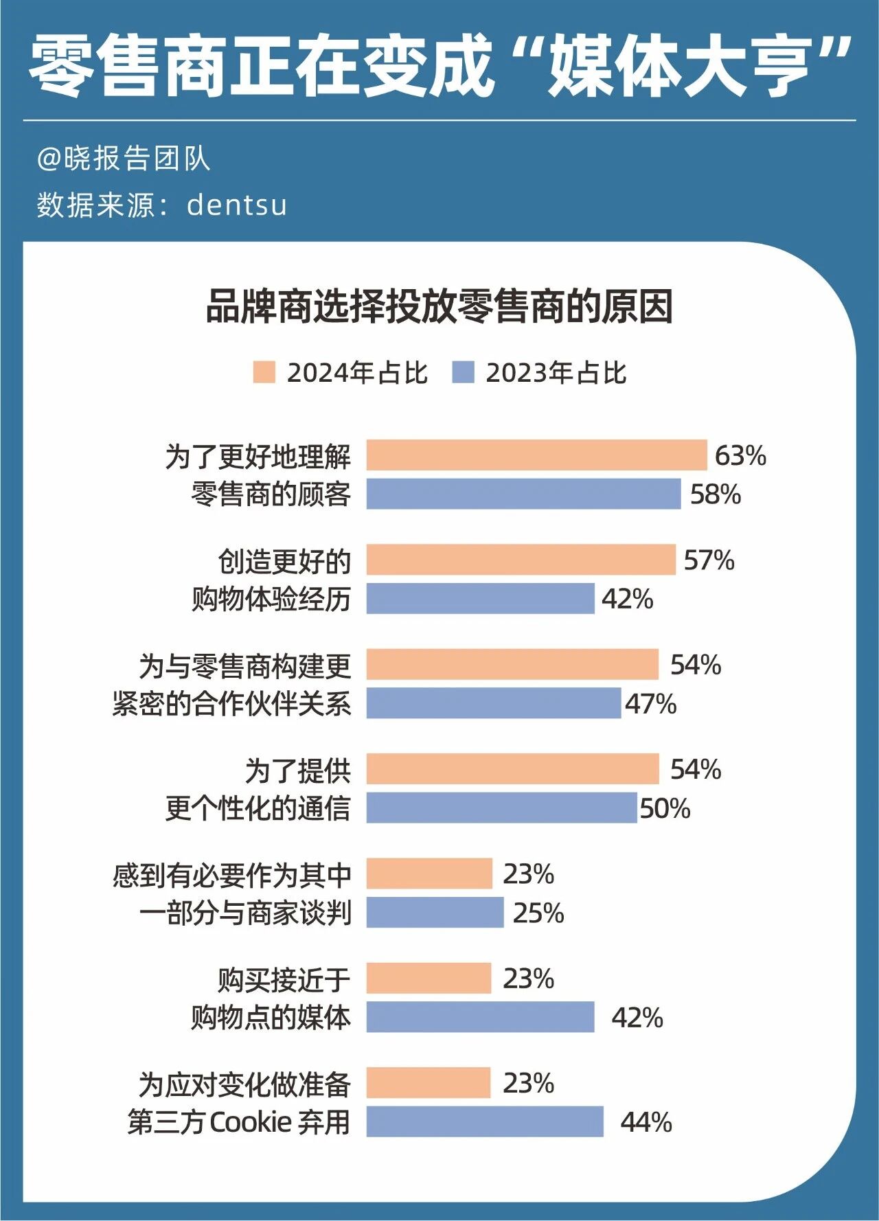 电通调研显示,2024年有63%的品牌投放零售媒体是为了“更深入理解顾客”,比2023年提升5个百分点。其次,有57%的品牌与零售商合作是为了“创造更好的购物体验”。