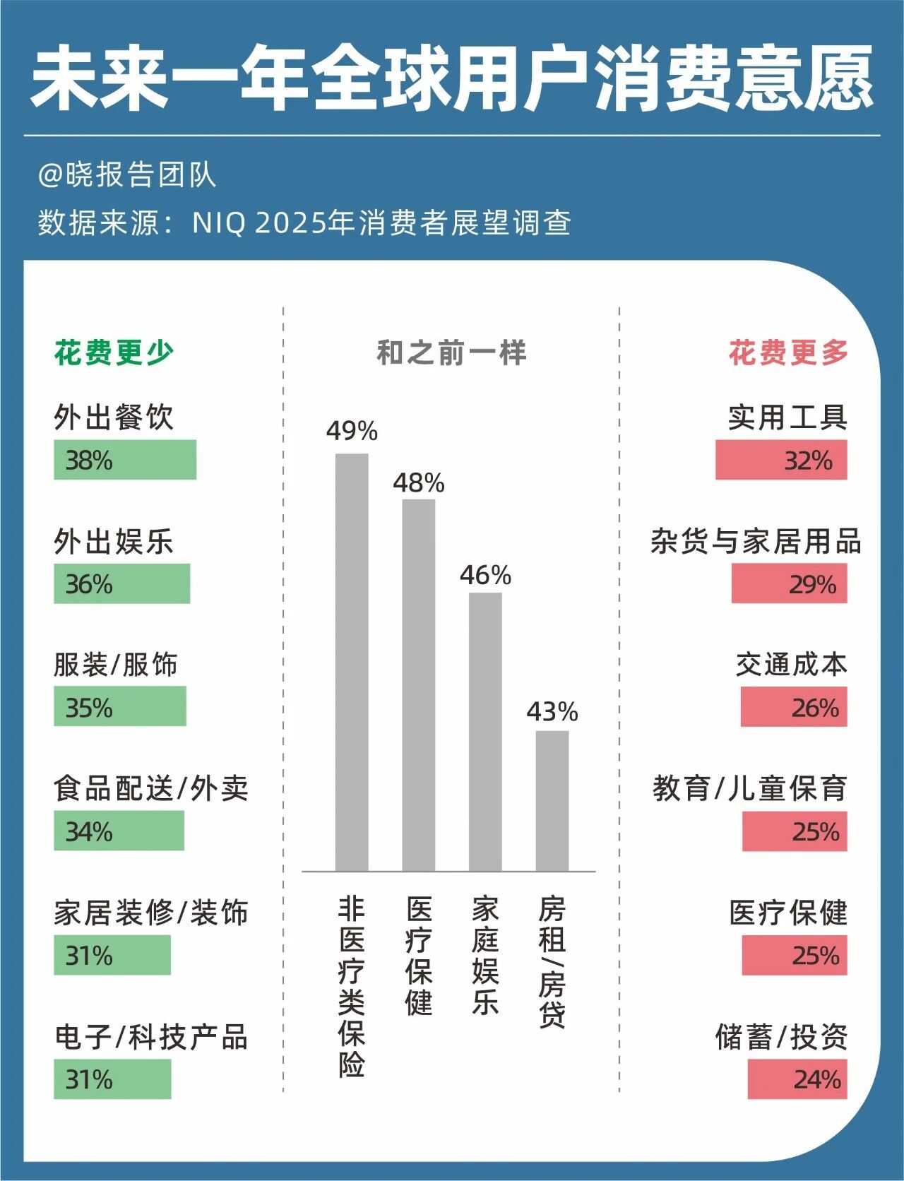 实用工具、杂货与家居用品、交通成本、教育/儿童保育、医疗保健和储蓄/投资这六项上花费更多;与此同时,在外出餐饮、外出娱乐、服装/服饰、食品配送/外卖、家居装修/装饰、电子/科技产品这六个类目上,花费更少。