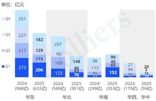 2025年,华东仍然是中国房地产大宗交易市场最为活跃的区域,占据了约全国50%的成交金额;华南成交金额略高于华北。