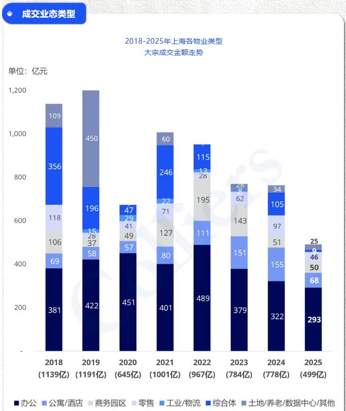 • 2025年,办公物业仍然是上海房地产大宗交易市场占比最大的业态,全年成交293亿元,但是成交量呈下降趋势。除去上半年超百亿成交的博华广场,投资和企业客户的交易成交金额基本持平。其中,在第四季度标志性的交易有货拉拉买下晶耀虹桥T6栋、奇瑞汽车收购华泾北杨人工智能小镇项目以及陆家嘴集团出售前滩源T1栋。
