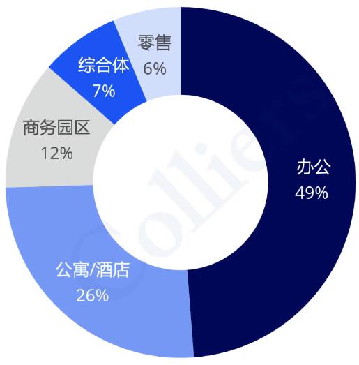 • 其次分别为公寓/酒店、零售、物流/厂房和商务园区等业态。
