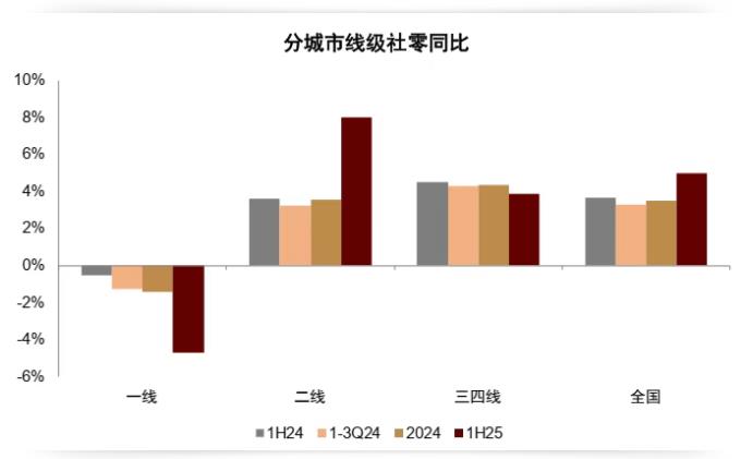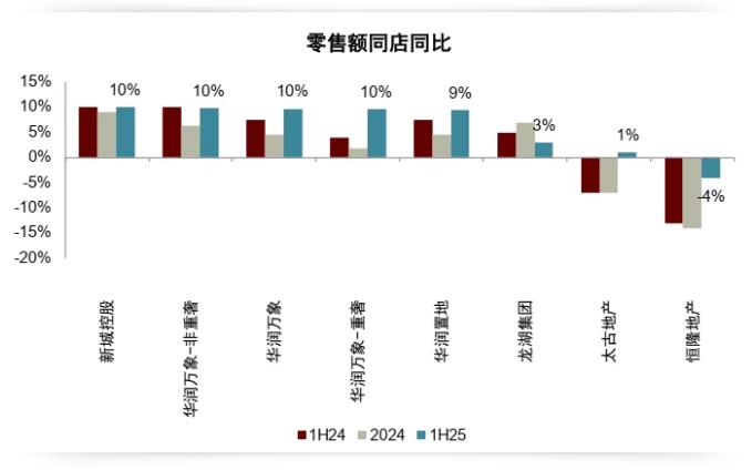 城市能级间分化趋势暂未出现可见扭转信号。我们观察到2024年至今,一线城市社零表现相较其他城市而言相对偏弱,2025上半年全国社零增速整体反弹背景下分化程度有所加大,这一现象或与人口结构、收入预期、房价水平等多重因素差异有关,目前暂未观测到宏观及微观信号驱使这一趋势转变。这一分化背景或对项目城市能级分布不同的购物中心运营商产生一定影响,但我们同时强调,对于商场经营而言,项目本身在当地市场的地位以及项目团队的运营能力或是对其经营绩效更为关键的要素。