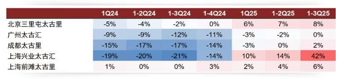 我们观察到重奢商场在2025年内呈现经营逐步修复的态势,尤其在三季度,恒隆及华润高端项目整体已经呈现好于一般非奢商场的同比增速。其背后原因我们认为有三个方面,其一为国内消费整体复苏以及消费外流明显放缓,其二为奢侈品牌调整店铺布局、关闭低效店铺的同时升级扩建高效店铺,其三则为商场运营商持续主动调改、积极引入各类对客流及销售额有显著正面贡献的业态及品牌[4]。