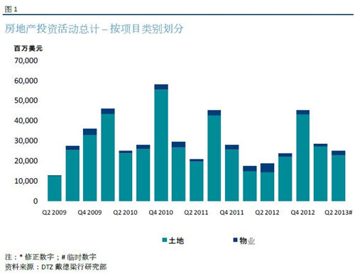按项目类别,根据DTZ 戴德梁行研究部所追踪的城市,第2季度的住宅投资放缓。住宅总投资额(包括土地及物业) 环比下跌9.2%,达到101.76亿美元。然而,根据其他中国媒体的报告,由于开发商仍积极补充优质土地作为储备,2013年上半年的土地交易总体仍是活跃的,尤其与平淡的2012年上半年比较。