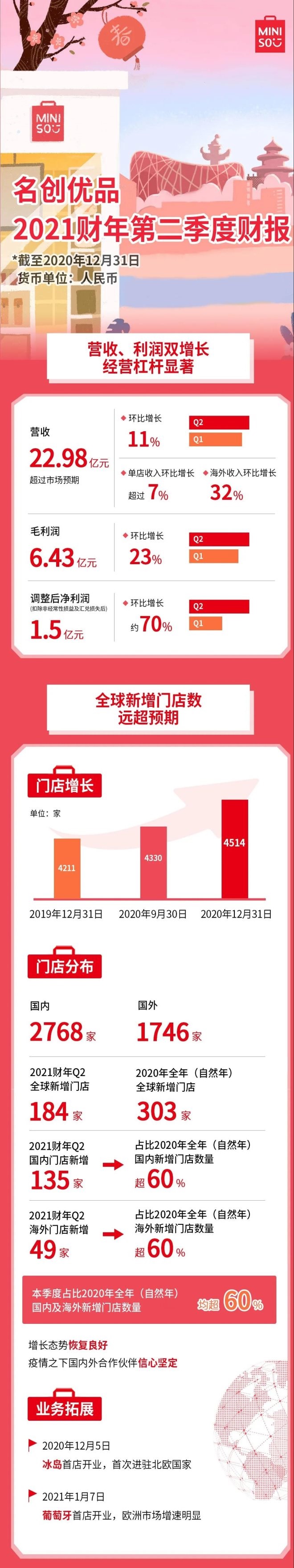 名创优品在2020年(自然年)累计新增门店达303家,海外业务新拓展至冰岛和葡萄牙两个国家。其中,2020年第四季度新增184家,占比全年新增门店数的60%。