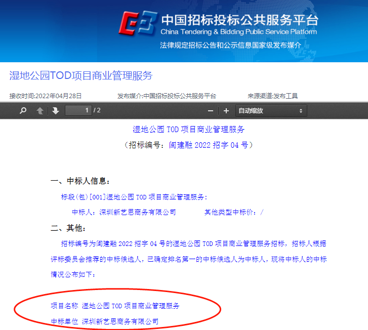 近日,厦门五缘湾湿地公园TOD项目商业管理中标结果已于近期出炉,由深圳新艺思商务有限公司中标。