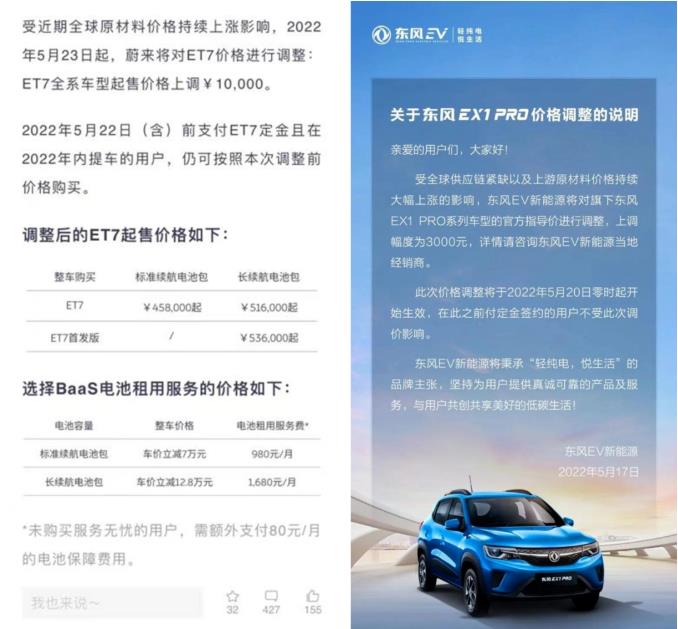 此外,新能源汽车也掀起了一波涨价潮,比亚迪、特斯拉、小鹏汽车、零跑、蔚来、东风汽车等多个新能源汽车品牌发布产品价格上调通知。主要是受当下全球原材料价格持续大幅上涨且供应商供货紧张等因素影响。