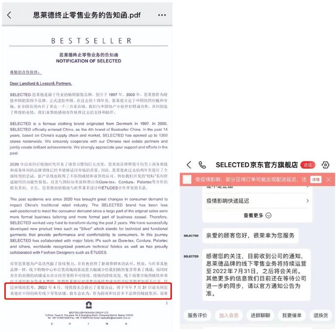 4月,作为绫致集团进入中国的第四个品牌——SELECTED思莱德对外宣布,将于今年7月31日前关闭在中国的所有线下零售门店。自2008年进入中国市场以来,该品牌于国内各地开设了1300家线下门店,且与多个知名运营商均建立了长期战略合作关系,然而自2020年首轮疫情后,该品牌便开始了多轮调整,以求能及时适应疫情下的市场变化,但在今年4月,该品牌最终还是难抵高额的店铺成本,做出关闭思莱德在中国所有线下零售店铺的决定。