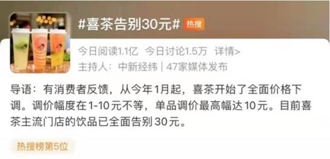 除涨价潮外,部分品牌也开始出现降价处理,以求在同行业竞争下的梯度转型,该现象在持续火热的新式茶饮领域最为直观。今年2月,一直走高端茶饮路线的喜茶对外宣布已完成全面产品调价,主流门店产品价格已全面低于30元,且售价在15-25元的产品已占据喜茶全部产品的60%以上。随后,今年3月,同梯度的奈雪的茶也开始宣布将进行大幅降价,推出20元以下新茶饮产品线轻松系列,并承诺每月上新“1字头”产品。新式茶饮赛道竞争更趋白热化,多个高端茶饮品牌的降价,一方面是受疫情下人们开始出现消费降级的变化,另一方面则主要是品牌期望通过降价形式实现门店转型,以求将本增效。