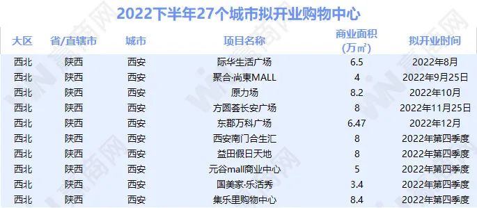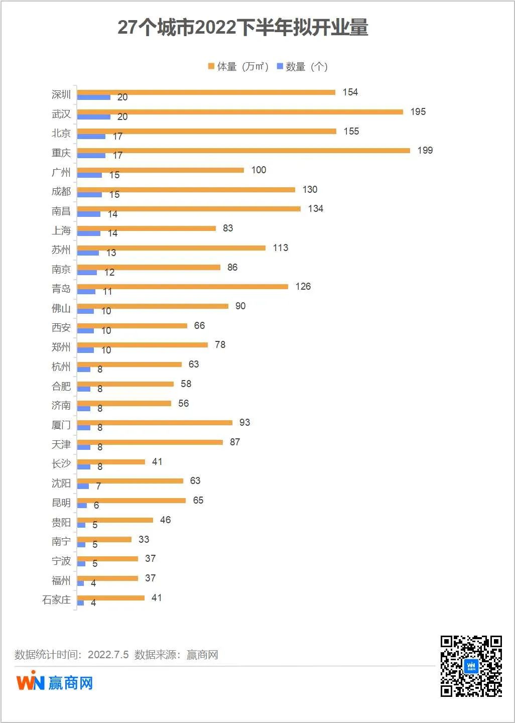 据赢商网不完全统计,全国27个主要城市下半年拟开业商业项目,数量超280个,体量超2400万平方米,接近2021年下半年实际开业量。