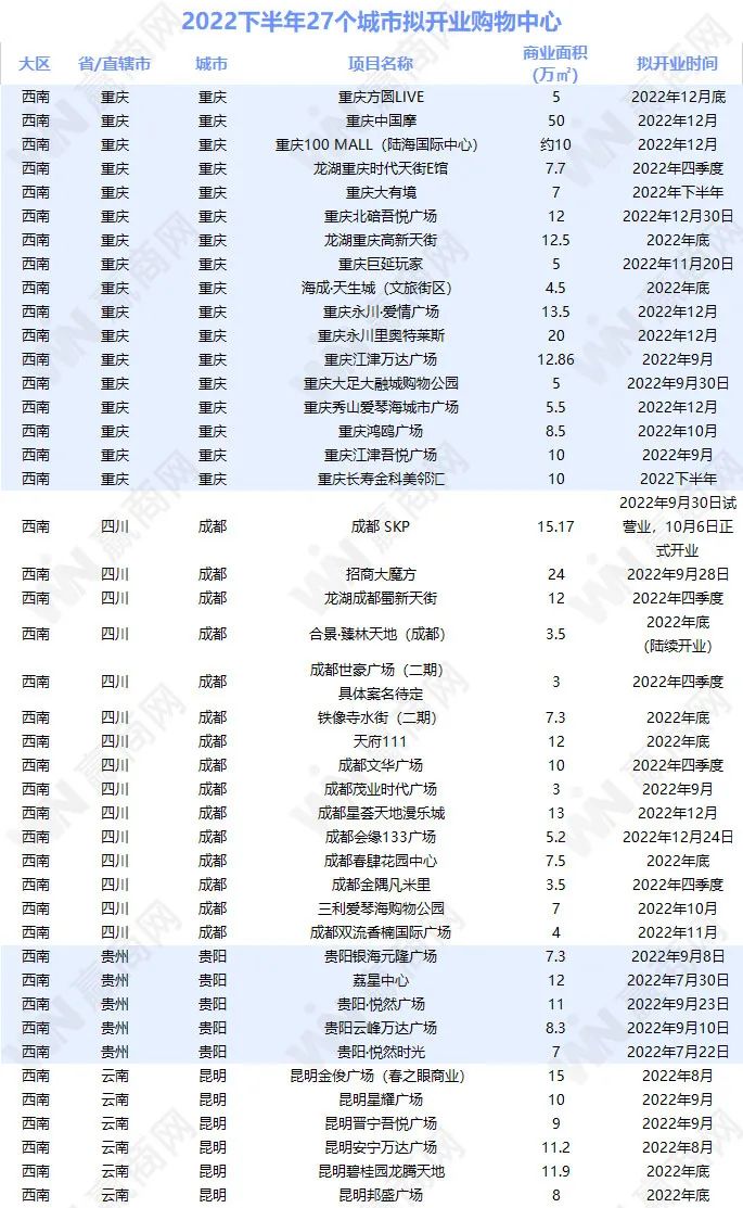 西南四大主要城市重庆、成都、昆明、贵阳下半年将迎来43个商业项目,合计体量438万平方米。重庆、成都依然是新开业购物中心高度集中城市。