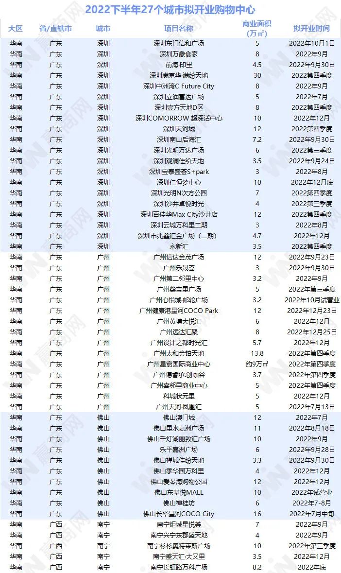 深圳:深圳下半年开业量位居全国第二,将有20个商业项目、150余万方体量,不仅数量多,看点也十足,备受市场期待。包括: