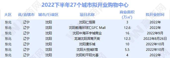 沈阳:沈阳将有7个项目开业,体量63万平方米,包括沈阳大悦城E馆、龙湖沈阳浑南天街、沈阳中海环宇城商业、沈阳前海环球汇GFC Mall等重点购物中心。