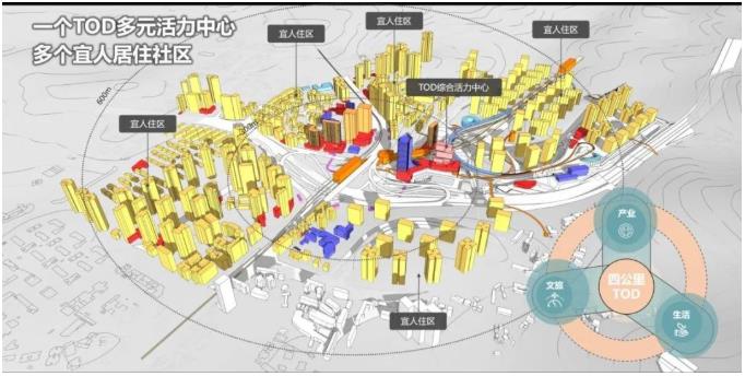 所谓TOD,就是“以公共交通为导向的城市发展模式”,以轨道交通站点为中心,以600~800米(5~10分钟步行路程)为半径进行高强度集约化开发,打造集工作、商业、文化、教育、居住、旅游等功能于一体的综合功能区。