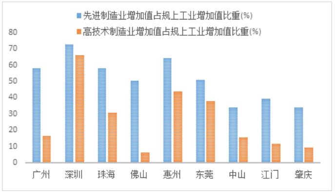 2021年,工信部开展的先进制造业集群竞赛中,评选出全国25个制造业集群优胜者,广东省是全国入围数最多的省份之一(江苏并列第一),有6个集群入围,都位于粤港澳大湾区。其中,与深圳相关的有4个,涉及新一代信息技术、先进电池材料、智能装备、高端医疗器械等产业;与广州相关的有3个,即广佛惠超高清视频和智能家电集群、广佛深莞智能装备集群和深广高端医疗器械集群,包含高清视频、智能家电、智能装备和医疗器械产业;涉及东莞和佛山的各2个,惠州1个①。