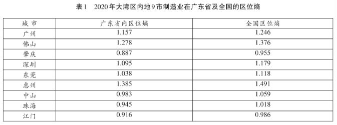 区位熵通常被用来衡量一个地区产业的空间分布情况,反映产业部门的专业化程度,以及该地区产业在区域内的地位和作用,能够反映出区域层面的产业集聚水平。区位熵值越高,产业集聚水平越高。计算粤港澳大湾区内地9市制造业在广东省和全国的区位熵,可具体分析大湾区城市层面的制造业集聚情况。