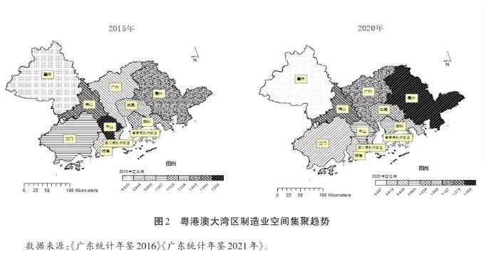 结果显示(表1),2020年,大湾区内地9市在广东省范围内,广州、佛山、深圳、东莞、惠州的制造业区位熵都在1以上,集聚水平较高;其中惠州集聚水平最高,其次为佛山、广州、深圳和东莞,肇庆的制造业集聚水平最低。从全国范围来看,大湾区内地9市的制造业区位熵均大于其在省内的熵值,仅有江门和肇庆的区位熵低于1,其他城市均在1以上,惠州、佛山、广州依然以较大优势居前三,进一步证实大湾区作为我国重要制造业基地的绝对实力。