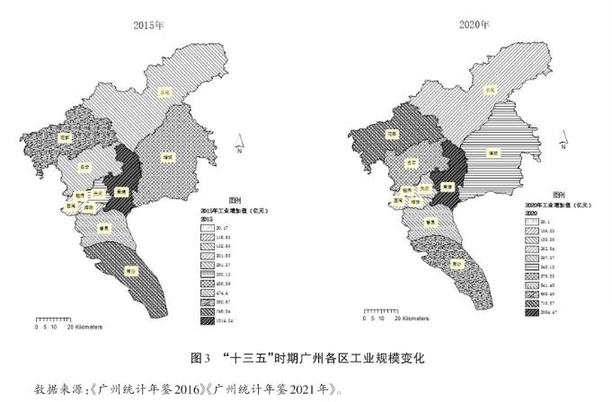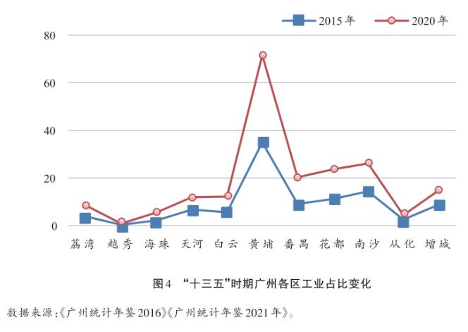 2020年2月,广州市公布《广州市工业产业区块划定成果》,以保障制造业发展用地,提高工业用地的集聚效益。全市共划定669个工业产业区块,明确区块内重点发展先进制造业,以及支持先进制造业和战略性新兴产业发展的创新、研发等高端产业,积极引导制造业有效集聚。从工业区块的区域分布来看,花都区和番禺区划定的区块数最多,分别占全市的25.4%和22.9%;海珠区最少,仅13个。从面积上看,黄埔区划定的工业区块最大,为101.49平方千米,占全市的16.3%;南沙、花都、增城和白云区紧随其后,均在80平方千米以上,分别占全市的16%、15%、14%和13%;荔湾和海珠区的面积最小,仅为4.79平方千米和1.86平方千米,只占全市的0.77%和0.3%③,体现出对制造业布局从中心城区向东部、北部和南部引导的总体思路。