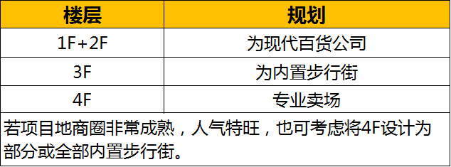 特殊情况下,在受到用地面积、建筑密度等规划条件限制致使开发面积过小,或当地城市人口基数大、现有商圈十分繁荣的条件下也可建五层,但总建一般应控制在4万㎡之内。