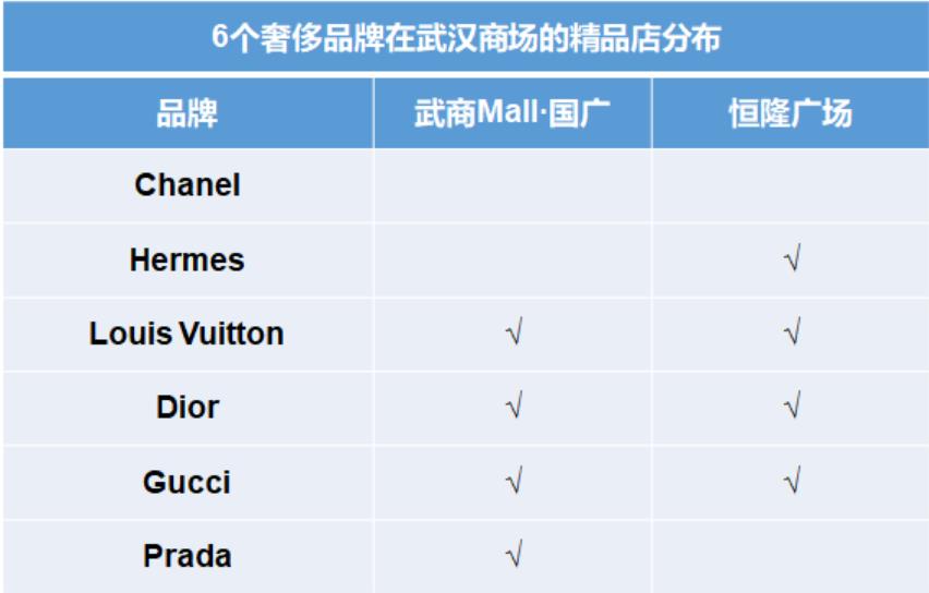 Balenciaga | Bottega Veneta | Burberry | BvlgariCartier | Celine | Chanel | ChaumetChloe | Chopard | De Beers | DIORDolce & Gabbana | Fendi | Ferragamo | Giorgio ArmaniGivenchy | Gucci | Hermes | LoeweLoro Piana | Louis Vuitton | Max Mara | MIU MIUMoncler | Panerai | Patek Philippe | PiagetPrada | Qeelin | Ralph Lauren | Roger VivierSaint Laurent | Tiffany&Co. | Tod’s | Vacheron ConstantinValentino | Van Cleef&Arpels | Versace | Zegna在我们观测的40个奢侈品(列表如上)中,从40个品牌的店铺总数来看,武汉共计有57家商场门店(不含奥莱折扣店、不含机场店、只计入独立专柜或店铺),其中八成的店铺位于武商Mall·国广及武汉恒隆广场。从6个代表品牌分布来看,目前CHANEL暂未进驻武汉。Hermes仅有一家店位于恒隆广场;此外,Louis Vuitton、Dior、Gucci均有两家店。