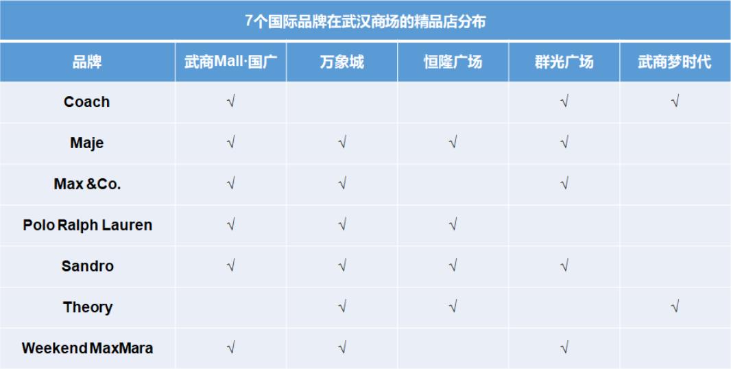 Acne Studios | Ami | Alexanderwang | ba&shBally | Brooks Brothers | Canada Goose | CanaliClub Monaco | Coach | Dunhill | Diane von FurstenbergEmporio Armani | Furla | G Givenchy | HoganHugo Boss | IRO | 三宅一生系列 | Jil SanderKenzo | Longchamp | Maison Margiela | MajeMarc Jacobs | Max &Co. | MCM | Michael KorsMoschino | Paul&Shark | Pinko | Polo Ralph LaurenSandro | self-portrait | Stuart Weitzman | TheoryTory Burch | Weekend MaxMara | We11done | Y-3在我们观测的40个国际精品&轻奢(列表如上)中,目前有32个品牌在武汉共计开设了近60家门店。Acne Studios、Ami、三宅一生系列、Kenzo等暂未进驻武汉。