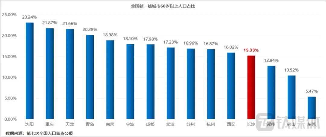 在全国新一线城市老龄化情况的排名中,长沙老龄化程度较低,可以看出目前长沙以年轻人居多,60岁以上的人口仅占长沙总人口的15.33%。