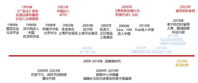 实体商业从1838年法国的第一个百货出现,到国内1917年先施百货的创立,到新中国北京百货大楼(王府井百货前身),到1996年广州天河城中国第一家购物中心,再到从2009年到2023年大量供给的出现,外资品牌撤出、国有购物中心伴随着城镇化率与综合体的爆发。从2001年中国加入WTO,才与世界具有全球化的协作和连接,2006年Zara进入,2018年,李宁作为国潮品牌兴起。2022年开始出台城市更新条例,说明中国已经过了快速的城镇化发展过程,进入了存量运营期。
