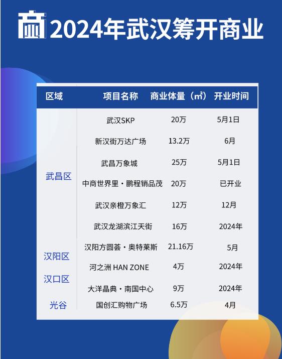 武汉SKP项目位于武昌区中山北路北侧、沙湖路东侧,由原武汉汉街万达广场及原武汉楚河汉街第二街区构成,商业建筑面积超20万方,营业面积约15万方,预计在今年5月1日开业。作为高奢商场的代表,SKP目前在国内仅开业三家,分别位于北京、西安、成都。武汉作为拥有第四座SKP项目的城市,武汉SKP将在保持SKP原有理念的基础上,结合武汉当地的文化和城市特色,融入更多的创新与全新高品质消费场景。与其他城市SKP最大不同在于,武汉SKP首设独栋门店:除了购物中心(原万达广场)外,SKP将在汉街第二街区布局奢侈品门店。据了解,武汉SKP项目会带来全新概念的“SKP-S”,引入“科技、艺术与时尚结合”的沉浸式体验空间。此外,武汉SKP计划引入超过1000个品牌,其中600多个系首次进入武汉国际品牌,涵盖美妆护肤、服饰皮具、珠宝腕表、生活家居等品类。从目前流出的品牌来看,包括GUCCI、Brunello Cucinelli、IRO、DIOR香氛等大牌。原汉街万达广场改建为武汉SKP后,关闭多年的武汉万达电影乐园改造成新汉街万达广场,预计今年6月开业。新汉街万达广场建筑面积13.2万平方米,地上6层,地下2层,在内部装饰上保留了之前的“金编钟”造型。项目定位为“以旗舰娱乐为引领,时尚酒吧为依托,品牌文化输出为特色”。要打造万达全国首座极致体验中心,再续首店效应。武昌万象城是华润置地在武汉打造的第二座商业综合体,位于武汉滨江商务区核心地段,附近有徐家棚三角路地铁站。武昌万象城分为地上8层和地下四层,总建筑面积约25万方,略大于汉口的武汉万象城。武昌万象城建筑设计撷取“高山流水”的美意,超2000平米的屋顶天幕引入天然光线,开阔的商业空间,如同步行于户外街区。武昌万象城共规划超500家全系品牌,超市已确定为Ole,影院是CGV影城。根据华润官微发布的综合体最新的进展以及实景图,目前武昌万象城已完成联合验收、竣备取证,预计今年5月1日正式开业。中商世界里鹏程·销品茂购物中心,原称武汉销品茂购物中心(简称“销品茂”),于2005年首次开业,位于武昌区徐东大街18号。2022年8月13日,销品茂宣布关门升级改造,2024年1月29日焕新开业。全新的中商世界里·鹏程销品茂购物中心由国外顶尖设计团队打造,羿天设计集团助力,提取城市客厅、城市记忆、城市主场三大主题,打造四大特色中庭,缔造17万方时尚潮玩社交体验中心。商场新增了大型水幕互动屏、胶囊型观光电梯、网红旋转楼,并在各处布置绿植装饰,增加空间的开放感与自然感。在品牌上,销品茂引入诸多创新业态:爆款IP“运动萌兽”室内运动主题乐园,主打年轻人群体;建筑面积4000平方米的一站式儿童娱乐中心,将打造成全新的亲子互动乐园;占地6000平方米的空中海洋公园也即将入驻,这也是华中地区首家室内海洋公园。武汉亲橙万象汇位于武昌区友谊大道及徐东大街交汇处,由华润集团和阿里巴巴联手打造,不仅是阿里巴巴华中总部配备的商业中心,也是武汉首个万象汇。武汉亲橙万象汇定位为都市精彩生活场,以“年轻、时尚、社交”的空间氛围为核心,旨在打造武汉最具话题度的商业空间,预计2024年底开业。武汉亲橙万象汇总建筑面积30万方,包含两座超甲级写字楼、其中商业建筑面积11.5万方,地下一层,地上六成,邀请benoy等国际设计团队主导设计,借以“孔明锁”构成手法,令不同空间立体交错、嵌套、重构,形神皆聚,互为支撑,优质的硬件条件为项目在丰富性、品质感及场景力的打造上提供空间。未来这里不仅有阿里巴巴及生态企业入驻,还将汇聚新零售等业态,打造集工作、商业、生活、创业为一体的智慧产业集聚区。武昌龙湖滨江天街项目紧靠5、7、8号线交汇的徐家棚地铁站,且无缝衔接长江公铁轨道,过江车辆无需出地面即可直接驶入地下停车场,交通十分便利。武昌滨江天街项目于2021年2月开工,目前购物中心主体结构已经封顶,整体正在进行招商,原计划于去年12月开业,目前来看项目推迟,预计于今年开业。作为武昌滨江商务区的核心商业,武昌滨江天街总面积达28万方,其中包含有16万方购物中心。作为武昌滨江商务区的核心商业,项目以「城市品质颜选生活中心」的商业定位,成为目前国内量级最高的「天街」系购物中心之一。河之洲HAN ZONE商业街项目位于琴台文化商业区,由新世界中国独立运营,商业体量约为4万方,预计今年年中开业。河之洲项目面临汉江,内有三条主街、三处中庭,再以公园点缀,构建出与「洲」字契合的美好意境。项目细分出「自然之洲、灵感之洲、浪漫之洲、烟火之洲、不眠之洲」5大主题街区,分别突出「动感户外、艺文策展、沉浸社交、邻里生活、夜娱玩聚」5大业态组团。河之洲秉承在地、艺术、自然、共生的理念,汲取千年汉水底色,糅合多元城市风貌,并依托周边琴台文化空间,打造美学商业的新天地,为武汉带来前所未有的“河滨文娱共生地”。未来,项目将着力引入「艺文策展、餐酒食集、音乐夜生活」等特色空间为载体,带来策展、沙龙、演出等艺文活动,与艺术家、广大市民及琴台中央文化艺术区产生更多互动,展现引领性的艺文特质与多元活力。武汉方圆荟·奥特莱斯位于龙阳大道与四新路口交汇处,处于汉阳区核心商业板块,总体量达21.16万方,商业面积16.5万方,将于2024年5月1日盛大开业。以“奥莱生活+欢聚中心”为核心,打造了“时尚惠聚