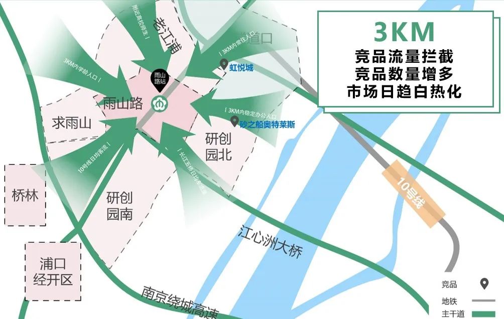 拥有稳定日通勤客流量的地铁10号线与过江大桥贯通,吸纳高校师生及高端人才的科创园区陆续启用,以及辐射主城区市民周末微度假的自然森林公园资源——随着基础建设日臻完善,三大客源交叉汇聚优势逐渐显露。此时的片区居民却尴尬发现,3km范围内尚无新商业综合体,消费需求可以说是「无处安放」。