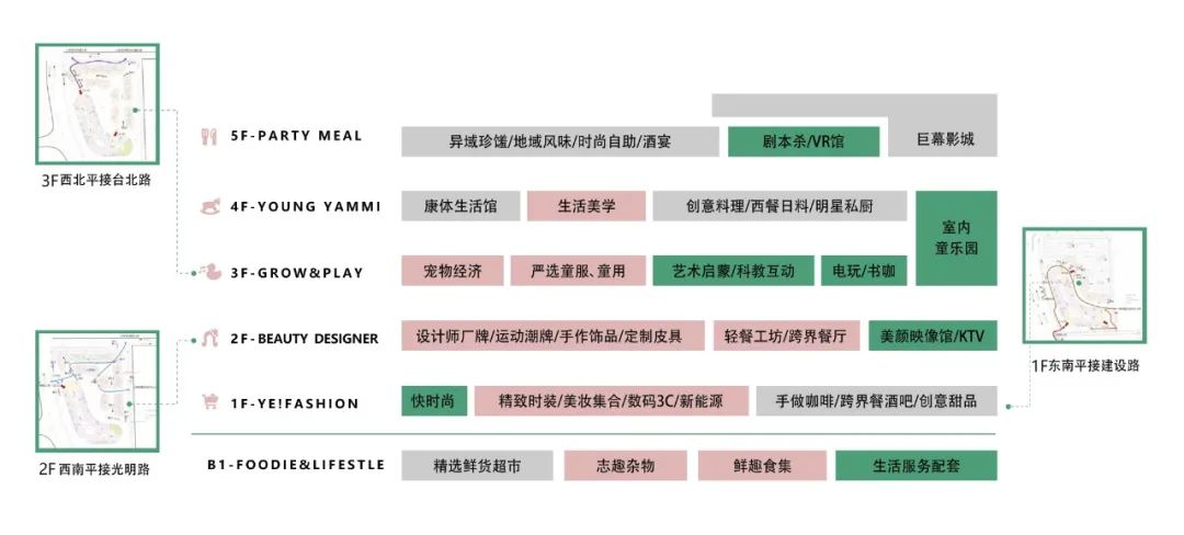 2)保留了原本的地势起伏,引入「山系」概念,巧妙利用现场坡度,设置了双首层结构,在最大化单层平面面积的同时,也提升了顾客从各个入口进场游逛的乐趣。