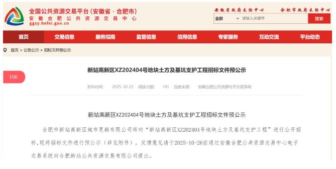 10.22日,根据合肥公共资源交易平台消息,新站区XZ202404地块土方及基坑支护工程公开招标。