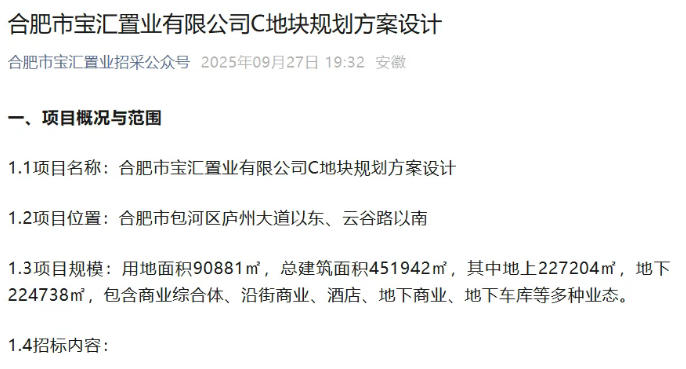 根据其官方公众号发布,合肥市宝汇置业有限公司C地块规划方案设计,目前正在招标。