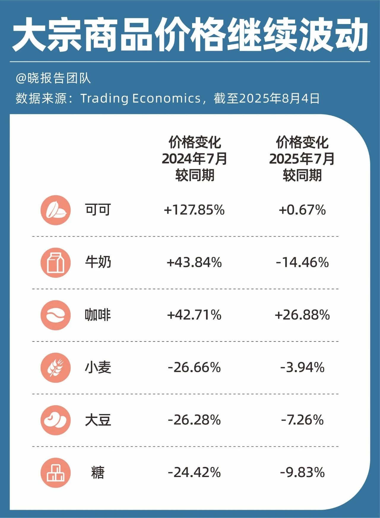 2024年至2025年间,咖啡价格上涨26.9%,而2023年至2024年间,可可价格价格更是飙升127.9%。