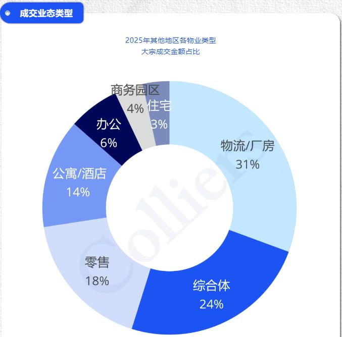 2025年,除一线城市外,物流/厂房项目是其他区域成交最多的业态。其中,在第四季度代表性的交易为蓝思科技股份有限公司6.02亿法拍买下广汽长沙菲亚特工厂。