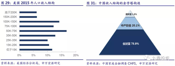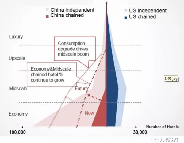 从宏观经济层面来看,酒店需求的最直接决定要素为居民收入水平与结构。美国的收入结构是比较典型的纺锤形,虽然经济危机之后贫富差距加大,但中产阶级的数量仍占主流,这使得美国的的酒店业结构分布也是纺锤型的。统计目前上市酒店企业按档次分高端酒店占总数的34%,中端占40%,经济型占26%,考虑到希尔顿、洲际等品牌没有经济型布局,而且美国以外布局以高端为主,实际上在美国本土经营的中端酒店占比应达到50%左右。这与人口收入结构一致,中端酒店占主流。中国目前的人口收入结构仍属于金字塔型,且从人均角度与美国仍有较大的差距,中短期还不具备构成纺锤型社会的条件,但中产阶级的绝对数量已经位居世界前列,而且还在快速成长,中端和中高端的需求增长迅猛。这也决定了国内酒店业市场仍将以经济型为主体,预计未来几年,经济型酒店数量仍将占据市场总量的60%,中端酒店则将达到总量的30%以上,即经济型酒店的一半,高端和超高端酒店为10%左右。