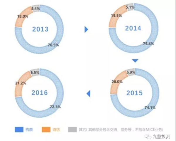 此外,根据艾瑞《2017年中国中小企业商旅管理行业调研报告》的数据,2016年中国中小企业商旅支出规模达到7337.7亿元,较2015年增长12.7%,占总体商旅支出市场规模的34.2%,可知2016年中国总体商旅支出市场规模大约为21000亿元人民币,与上述GBTA数据一致。而根据中小企业商旅管理市场的数据,酒店支出占中国中小企业总体商旅支出的比例为15.1%。