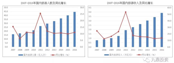 过去五年全国旅游经济整体上扬,年增长率始终保持在两位数水平。2017年,全国旅游总收入达到5.4万亿元人民币,同比增长15.1%,人均旅游消费达910元人民币。2017年国内旅游市场为50亿人次,比2012年增长69.12%,年均增长11.08%;2017年国内旅游收入为4.57万亿元,比2012年增长101.15%,年均增长15%。此外,全国每年还有6000万人次左右的过夜入境游客,带来约8000亿元的国际旅游收入。近十多年来,伴随着经济的发展和人们收入水平的提升,旅游逐渐从少数人的奢侈性消费,变成了大多数人的日常消费,旅游成为国民消费的重要支出,根据携程《2017中国旅游者意愿调查报告》显示,98%的受访者当年有出游意愿,5成以上的人计划全年旅游花费在年收入的10%以上,超过7成的人旅游预算超万元。国内旅游人数已经从2007年的刚刚超过15亿人次,人均约1次,快速增长到了2017年的50亿人次,人均3.6次,而且旅游收入的增长显著快于旅游人次的增长,消费升级带动了人均消费支出的提升。