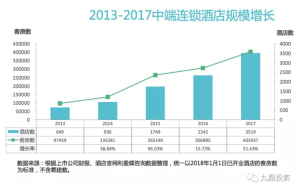 伴随近几年的消费升级大趋势,以及酒店行业自身由于租金、成本上涨引发的产业升级调整,有限服务中端连锁酒店从2013年开始发展萌芽,2016年之后发展速度逐步超越了经济型连锁酒店,成为酒店行业最近几年最受瞩目的细分领域。未来的三到五年,将是中端酒店爆发式增长的黄金时期,过往酒店行业的投资案例证明,在行业爆发之前,选择有一定实力和发展基础,成长性强的中端酒店品牌,通过资本的力量助其快速扩张,跑马圈地,未来必将获得丰厚的回报。