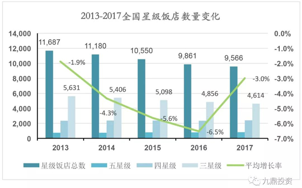 根据国家旅游局公布的数据,如下图所示,从2013年起,全国星级饭店的总体数量呈逐年下降趋势,其中五星酒店数量缓慢增长,四星保持相对稳定,一二三星的数量都在显著下滑: