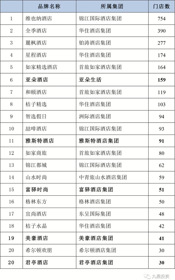 表2-1:主要中端酒店品牌门店数量(截止2017年底)