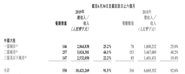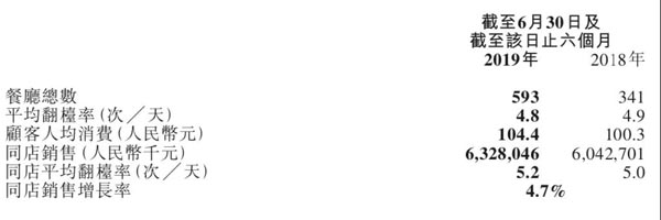 收入主要来自餐厅经营,占总收入的96.9%。从去年同期的71.52亿元,显著上升为113.31亿,增长了58.4%。主要由于2018年下半年及2019年上半年新开259间餐厅。