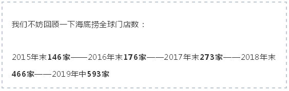 2019年上半年,海底捞新开门店130家,全球门店从2018年底的466家,增至2019年6月30日的593家。