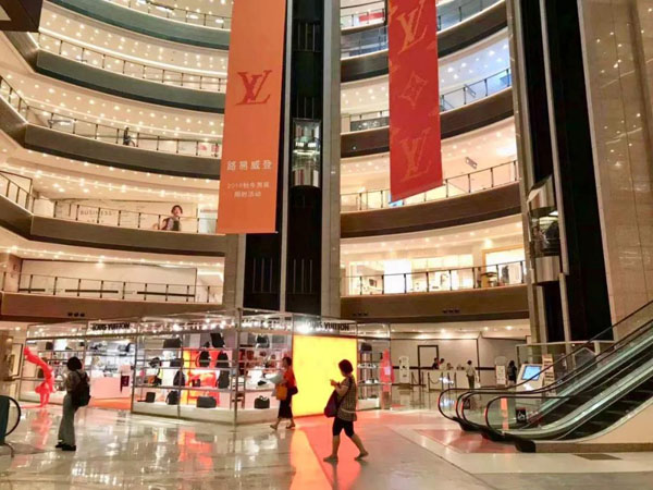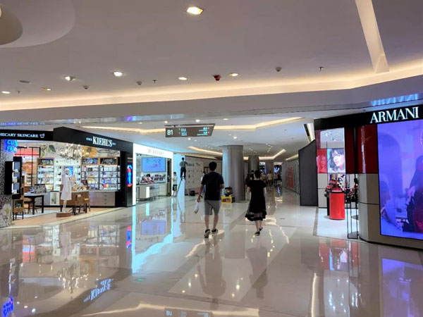 涵盖南座的主体部分调整工程仍在进行,地下一层正陆续开业,引进了Dior,Chanel,Giorgio Armani,Fresh,Sisley,Sulwhasoo,Burberry,Kiehl's等国际化妆品,以及ZARA,i.t,Sephora等大面积租户。位于中庭的Louis Vuitton男装快闪店为商场增加了很多话题性,品牌长期店铺目前也已经上围挡。