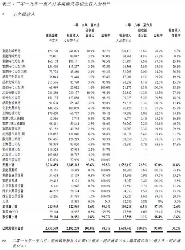 在二十余个天街项目中,重庆时代天街Ⅲ期、重庆U城天街Ⅱ期、重庆源著天街、北京长楹天街、苏州狮山天街、杭州滨江天街Ⅰ期等项目,租金收入同比增长均超过20%。