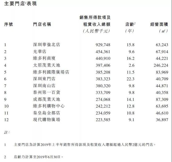 2019年上半年,销售所得款项及租赁收入总额超过人民币2亿元的门店如下:
