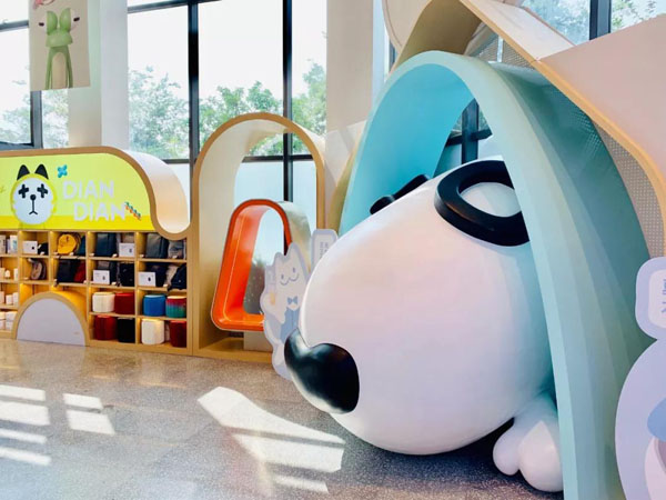 极宠家首店坐落于南京江宁百家湖畔,邻近金鹰国际购物中心,属于江宁区最繁华的地段。门店的风格偏“萌”,宠物雕塑比比皆是,宠物玩偶随处可见。
