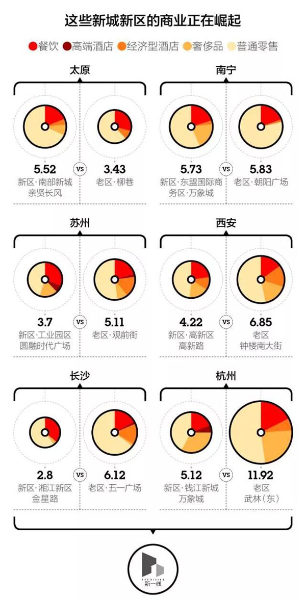 在观察城市的商业空间现状时我们发现,一些城市的新区已经有超过老城区的势头了。