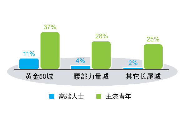 同时,尼尔森报告研究表明,带动消费的高端人士(25-44岁且收入8000元以上)、主流青年(18-34岁且收入高于温饱人群)、大众宝妈(25-44岁有小孩且收入高于温饱人群)这三类高潜力消费人群,随着城市梯队的下沉而逐渐减小,消费力逐渐递减。尤其是高端人士和主流青年,在头部黄金城中分别占11%和37%;腰部力量城中高端人士占4%,主流青年占28%;尾部城市的高端人士和主流青年占比为2%和25%。
